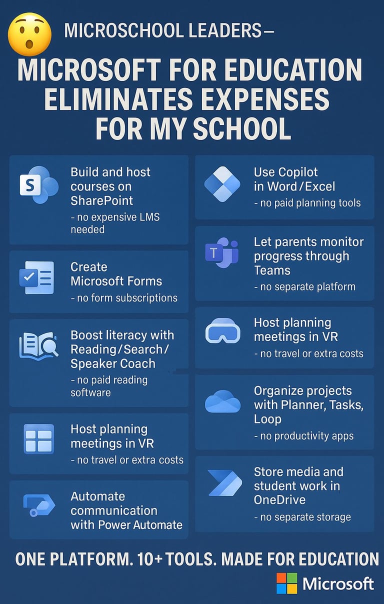 At MARS, we use Microsoft to run nearly every aspect of our hybrid program—from course creation and student tracking to virtual meetings and parent engagement. It’s replaced over 10 paid tools, saved us thousands, and streamlined our entire tech stack.